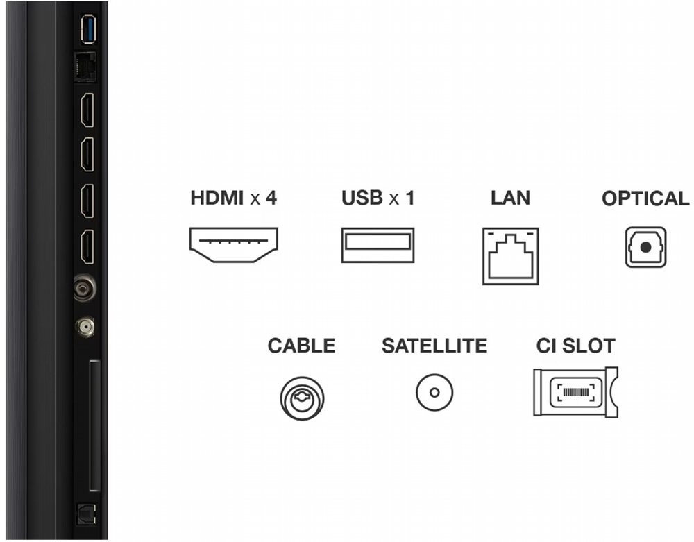 Op het gebied van aansluitingen biedt deze televisie alle flexibiliteit die je nodig hebt. Met drie HDMI-poorten (waaronder HDMI 2.1 met eARC en ALLM), twee USB-poorten, een optische audio-uitgang, ethernet, een CI+-slot en ondersteuning voor Bluetooth en wifi verbind je moeiteloos al je randapparatuur.