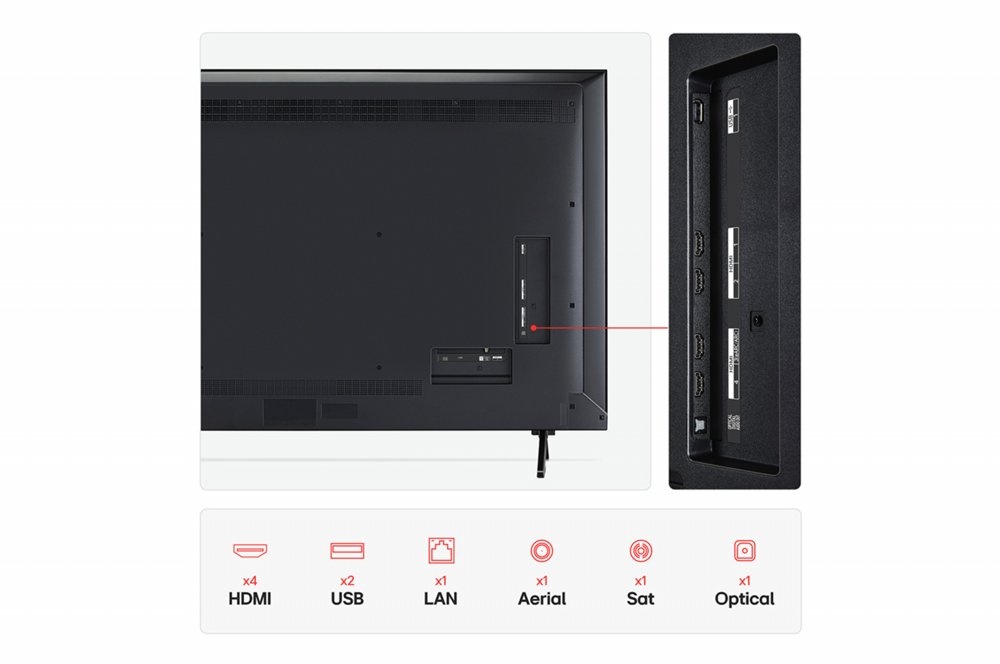 Qua aansluitingen is de tv uitgerust met vier HDMI 2.1 poorten met ondersteuning voor 4K 120Hz, eARC, VRR en ALLM, twee USB 2.0 poorten, een Ethernet aansluiting, optische audio uitgang en RF ingangen. Draadloze connectiviteit bestaat uit WiFi 6 en Bluetooth 5.3, waardoor de tv geschikt is voor moderne randapparatuur en streaming toepassingen.