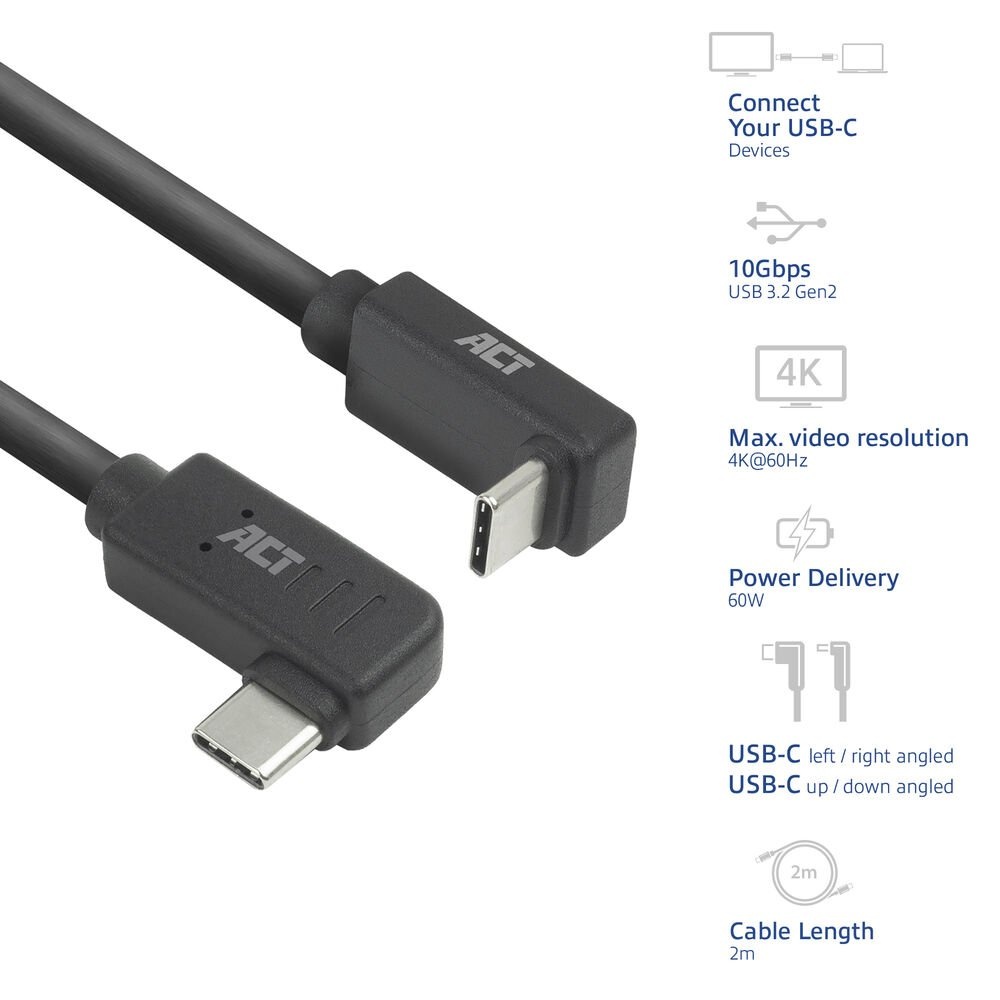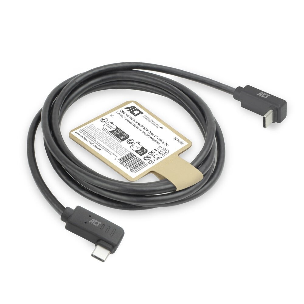 AC7482 | USB 3.2 Gen 2 Kabel | USB-C (haaks links/rechts) naar USB-C (haaks boven/beneden) | 60W | 10Gbps | 2m | Zwart