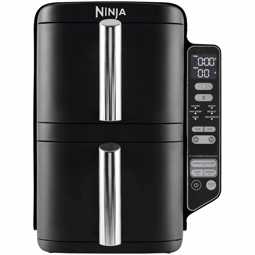 De Ninja SL300EU Double Stack Airfryer in elegant zwart is de ideale keukenhulp voor iedereen die gezond en snel wil koken zonder in te leveren op smaak of gemak. Met een royale inhoud van 7,6 liter verdeeld over twee gestapelde manden van elk 3,8 liter bereid je moeiteloos een maaltijd voor het hele gezin. Je kunt er een complete kip van 1,2 kilo in garen of 400 gram friet per mand knapperig bakken, ideaal voor zowel dagelijkse maaltijden als etentjes met vrienden.Dankzij het krachtige vermogen van 1750 watt warmt de Ninja SL300EU razendsnel op en bespaar je tot 55 procent tijd in vergelijking met een traditionele oven. De geavanceerde heteluchttechnologie zorgt voor een gelijkmatige bereiding met tot 75 procent minder vet, waardoor je geniet van knapperige gerechten met een gezondere twist. Met kookstanden als Air Fry, Max Crisp, Roast, Bake, Dehydrate en Reheat is dit apparaat veelzijdiger dan een gewone oven of friteuse. Dankzij de SYNC functie worden beide manden perfect op elkaar afgestemd, zodat hoofdgerechten en bijgerechten precies tegelijk klaar zijn.