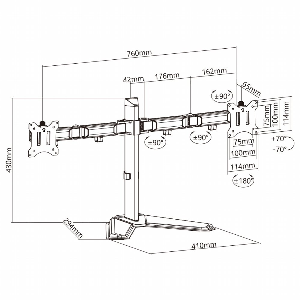 Met een armbereik van 380 mm kunnen de monitoren flexibel worden gepositioneerd, terwijl het geïntegreerde kabelbeheersysteem helpt om kabels netjes en georganiseerd te houden. De installatie is eenvoudig dankzij de stevige bureaubevestiging, die zowel met een klem als met een doorvoerbevestiging kan worden uitgevoerd.